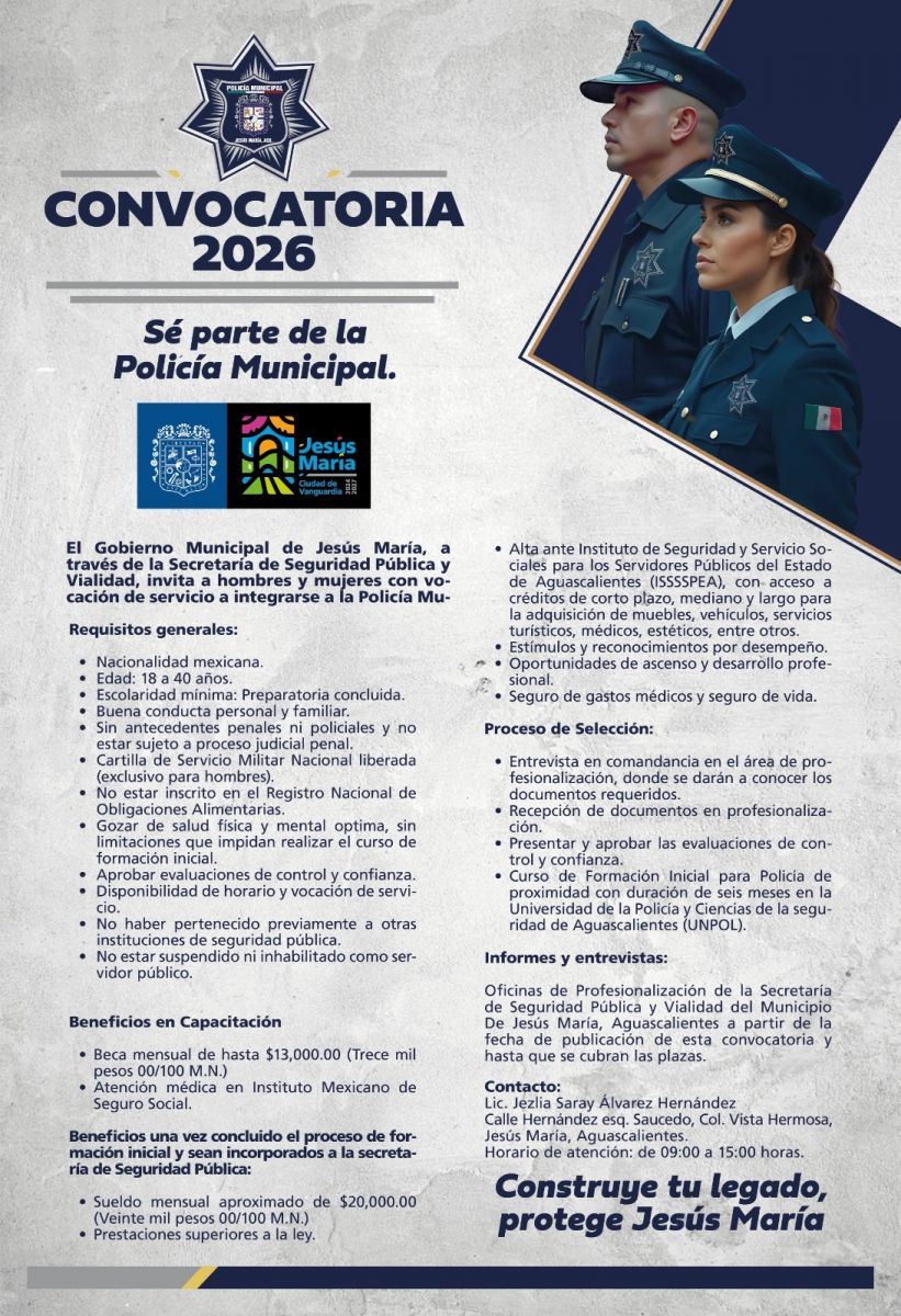 Jesús María, AGS; El gobierno municipal de Jesús María, a través de la Secretaría de Seguridad Pública y Vialidad, informa que ya se encuentra abierta la convocatoria para formar parte de la generación 2026 de la Policía Municipal, por lo que hace un llamado a hombres y mujeres con vocación de servicio a integrarse a las filas de la corporación.Entre los requisitos principales se encuentran: tener entre 18 y 40 años de edad, contar con preparatoria concluida, no tener antecedentes penales o policiales, ni estar inhabilitado como servidor público, así como aprobar las evaluaciones de control y confianza, entre otros.Durante el proceso de formación inicial, los aspirantes obtendrán una beca mensual de hasta 13 mil pesos y una vez concluido su proceso de formación, al incorporarse a la Secretaría de Seguridad Pública y Vialidad, recibirán un sueldo mensual aproximado de 20 mil pesos, además de oportunidades de ascenso, desarrollo profesional y prestaciones ante el ISSSSPEA, que incluyen acceso a créditos y otros beneficios.Las y los interesados deben acudir a las oficinas de Profesionalización de la Secretaría de Seguridad Pública y Vialidad de Jesús María, ubicadas en la calle Hernández, colonia Vista Hermosa, en un horario de 09:00 a 15:00 horas.