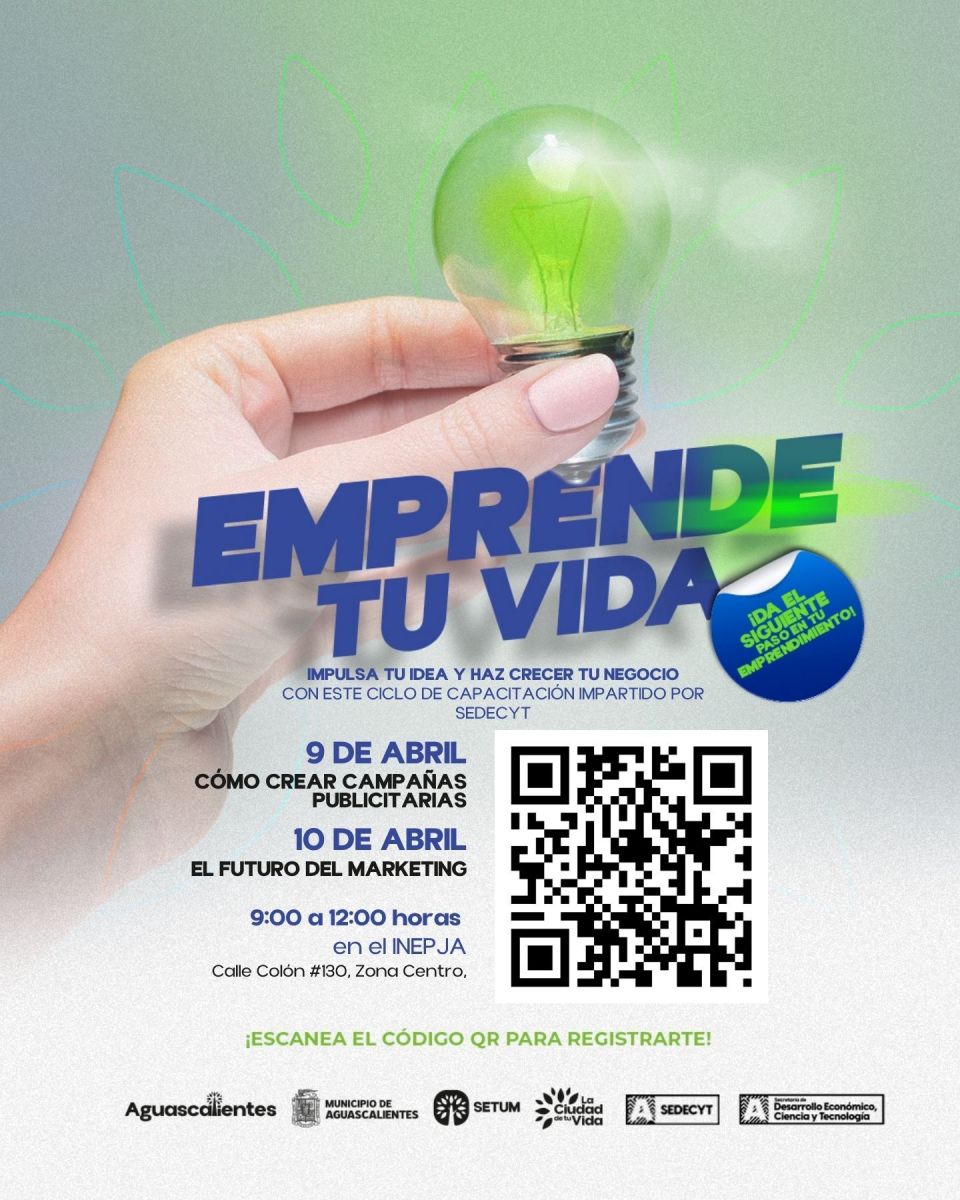 Aguascalientes, AGS.- Con el objetivo de fortalecer el desarrollo económico y brindar herramientas prácticas a los emprendedores, el Municipio de Aguascalientes, a través de la Setum, invita a participar en el programa “Emprende tu Vida”, cuyas capacitaciones serán impartidas por la Sedecyt los próximos 9 y 10 de abril.