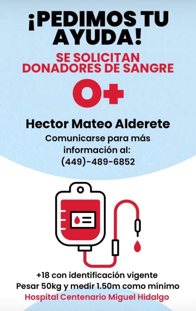 Para quienes deseen apoyar mediante donación de sangre, se indicó que pueden acudir al hospital mencionado y registrar la donación a nombre de Héctor Mateo Alderete. Asimismo, se habilitó un número de contacto para brindar mayor información sobre el proceso: 449-489-6852