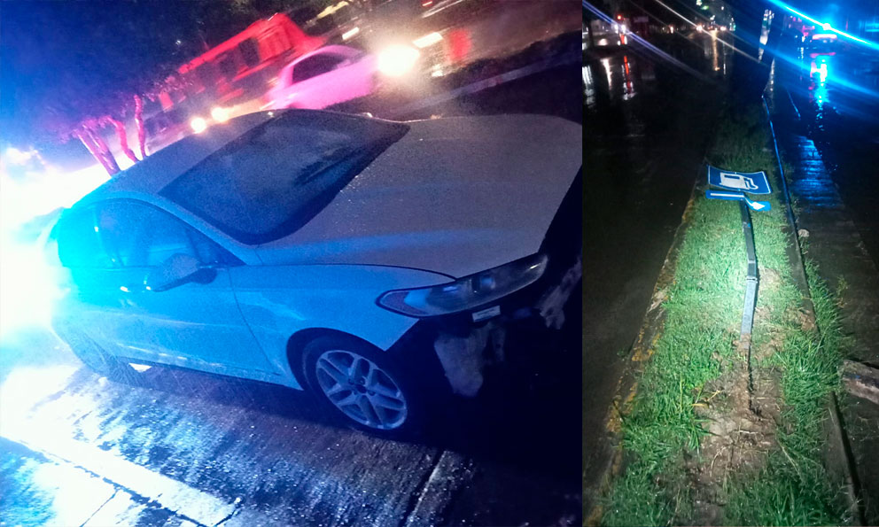 Auto a exceso de velocidad se impacta contra señalamiento público